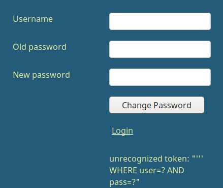 So now we know that “New Password” is injectable, and “WHERE user=? AND pass=?” forms part of the underlying SQL statement.