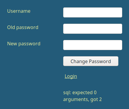 Entering a ‘ in each field in turn returns “Failed to change password” for the first two but throws an error for the “new password field”